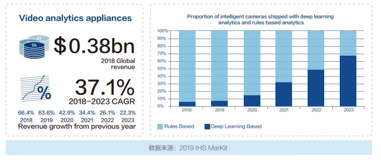 AI技术的迅猛发展促进了全球视频分析产业的快速成长 近年来深度学习技术的迅猛发展,驱动了整体视频分析产业的快速成长。有数据指出,2018-2023年,视频分析产品的整体市场 规模CAGR预测达到37.1%;摄像机基于深度学习分析的智能化比例预计会从5%增长到66%。