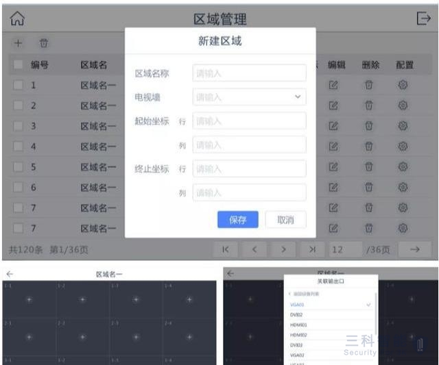4、区域管理,添加区域名称,选择电视墙,起始坐标几行几列,点击保存。进入对应区域名称的页面,关联输出口选择要关联的输入设备编号名称,保存。即可完成解码上墙操作。