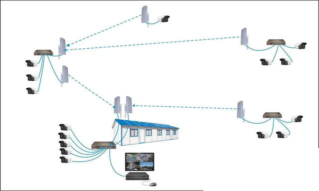 鱼塘一般面积大、地形复杂、施工布线难而且摄像头点位多,因此一般采用无线网桥传输,无线网桥自动选频,能避免网桥之间的频率干扰,信号传输距离远,施工难度小,视频信号传输稳定,可将无线网桥与智能警戒摄像头安装在同一监控杆上。部分条件受限制的地方可采用太阳能板给无线网桥和摄像同时供电,减少布线的难度,多对网桥之间需间隔1m以上,网桥需配对且正面对齐使用。