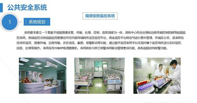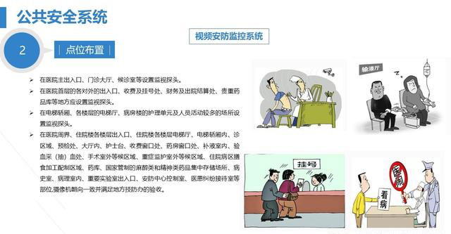 Ø在医院周界、住院楼各楼层出入口、住院楼各楼层电梯厅、电梯轿厢内、诊区域、预检处、大厅内、护士台、收费窗口处、药房窗口处、补液室内、验血采(抽)血处、手术室外等候区域、重症监护室外等候区域、住院病区膳食加工配制区域、药库、国家管制的麻醉类和精神类药品集中存储场所、病史室、病理室内、重要实验室出入口、安防中心控制室、医患纠纷接待室等部位,摄像机朝向一致并满足地方技防办的验收。