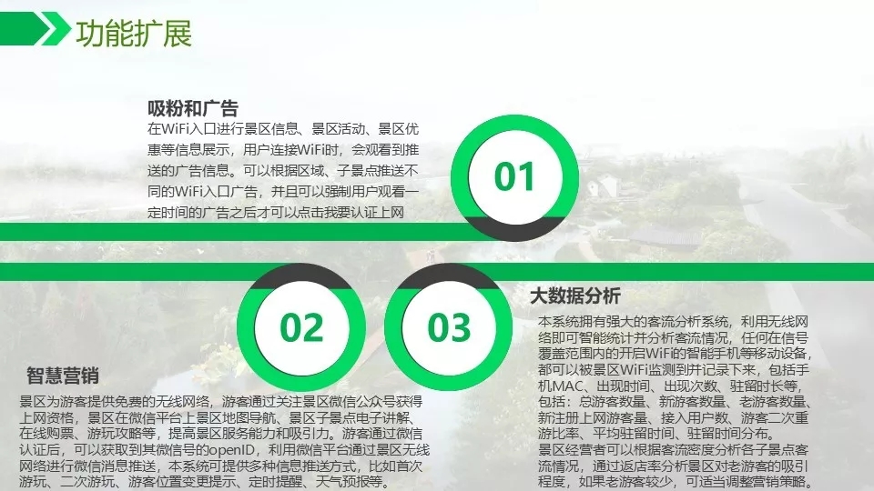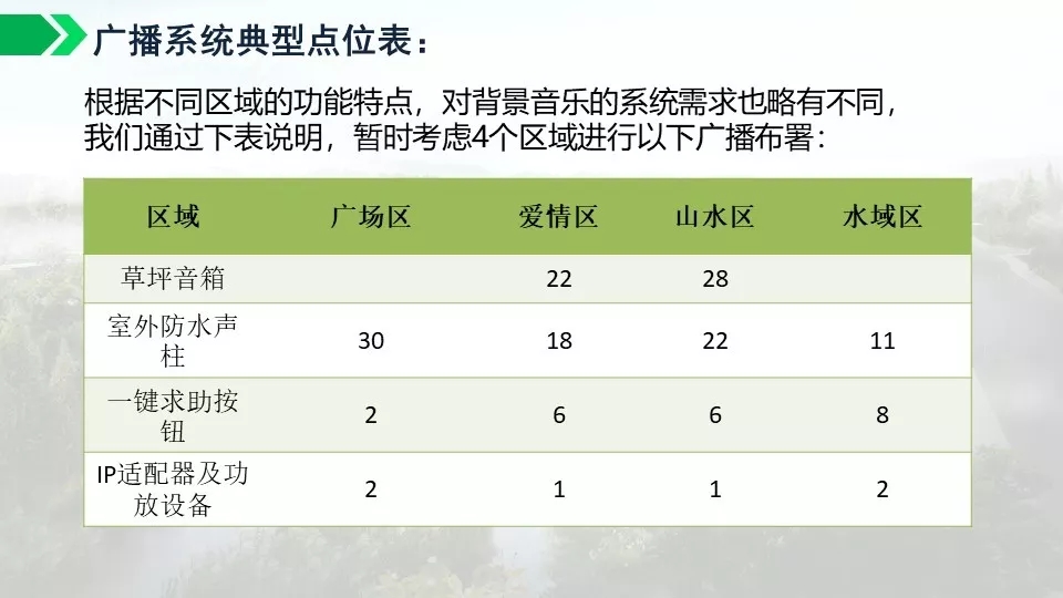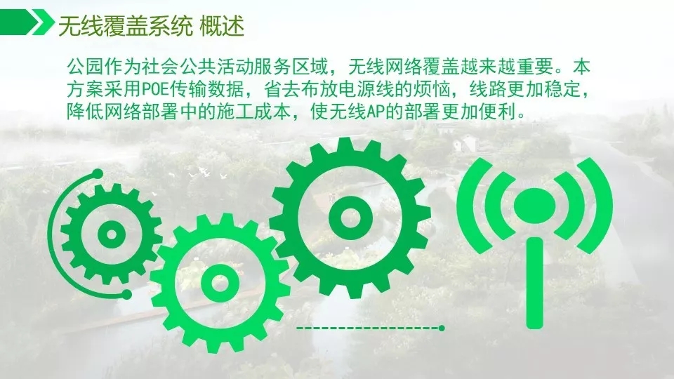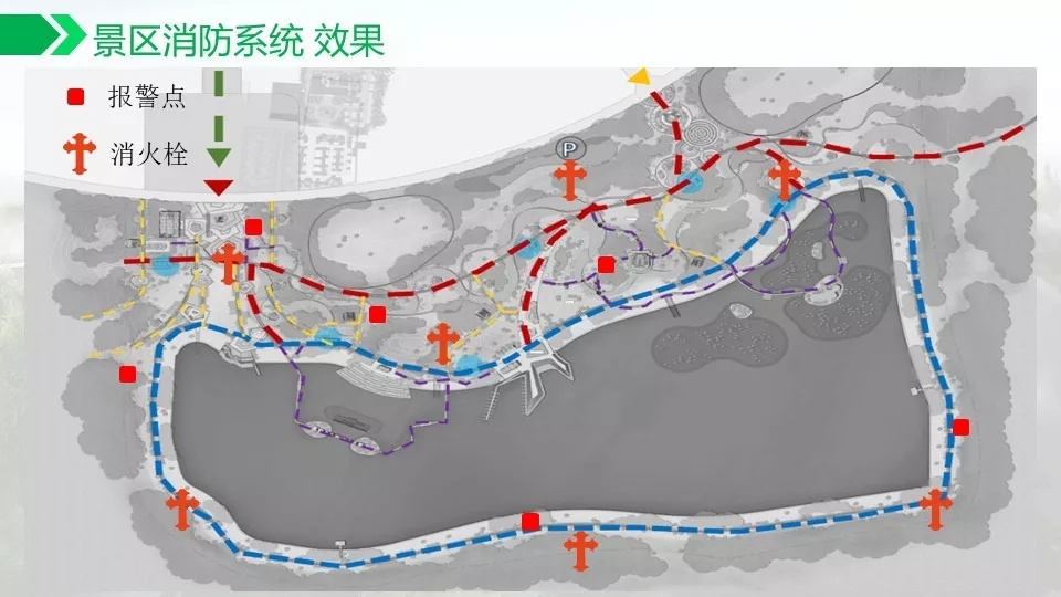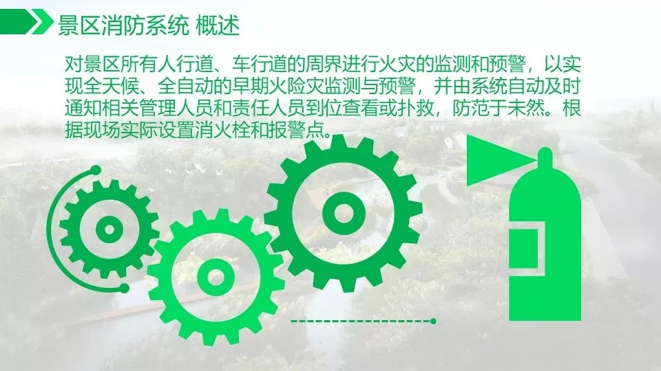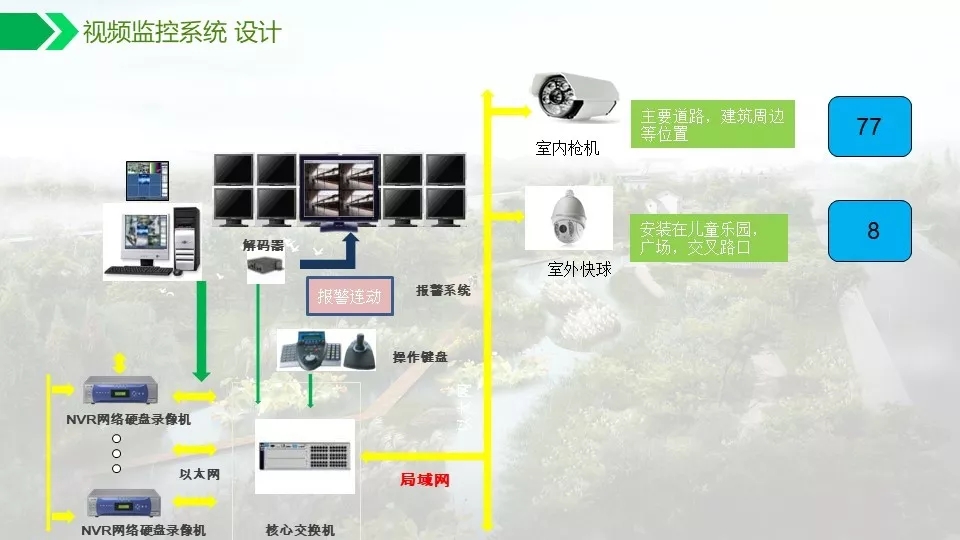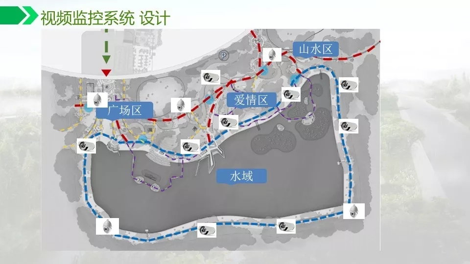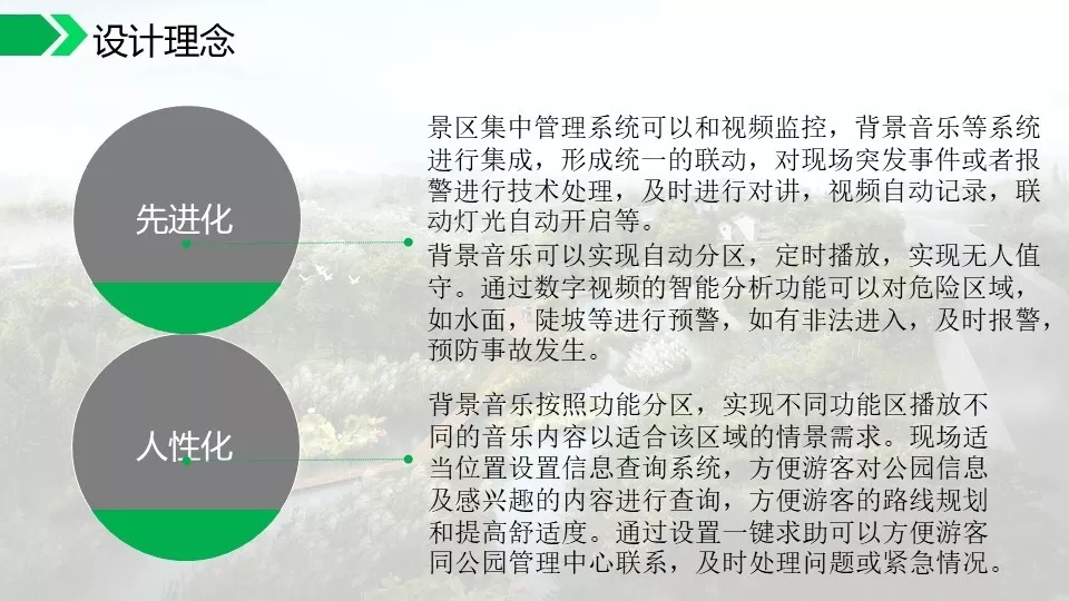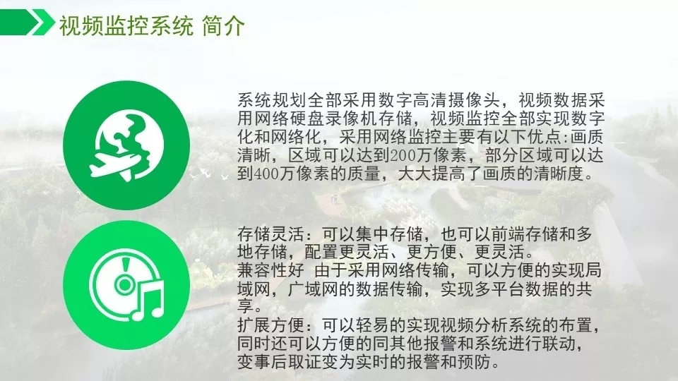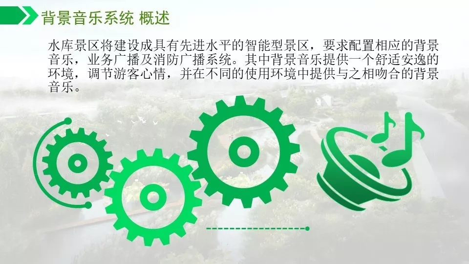 背景音乐可以实现自动分区,定时播放,实现无人值守。通过数字视频的智能分析功能可以对危险区域,如水面,陡坡等进行预警,如有非法进入,及时报警,预防事故发生。