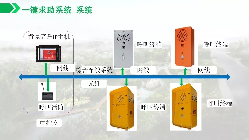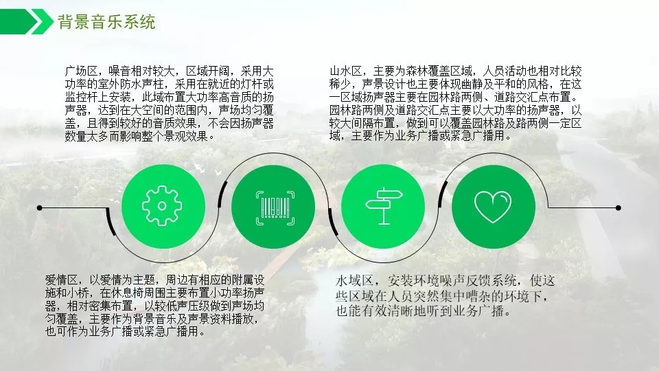 背景音乐按照功能分区,实现不同功能区播放不同的音乐内容以适合该区域的情景需求。现场适当位置设置信息查询系统,方便游客对公园信息及感兴趣的内容进行查询,方便游客的路线规划和提高舒适度。通过设置一键求助可以方便游客同公园管理中心联系,及时处理问题或紧急情况。