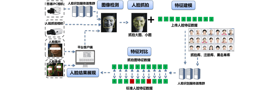 实时视频人脸比对:普通高清网络摄像机的实时视频流或人脸抓拍单元的人脸图片流,会由人脸识别服务器下的动态人像算法进行人脸特征数据提取,并实时与黑名单库中的人脸特征数据库进行遍历比对,并反馈平台每次比对结果。