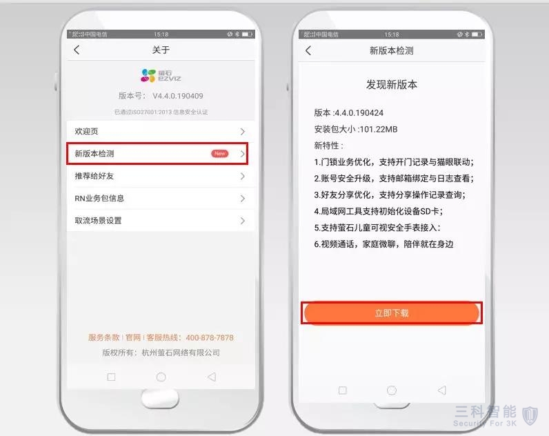 登录萤石云APP界面后在我的-关于-新版本检测后点击立即下载