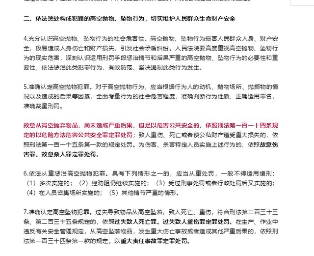 鉴于蜜桃视频在线观看视频、坠物事件频发,影响日益严重,最高人民法院终于在最近对外公示了《关于依法妥善审理蜜桃视频在线观看视频、坠物案件的意见》;《意见》中明确指出:“近年来,蜜桃视频在线观看视频、坠物事件不断发生,严重危害公共安全,侵害人民群众合法权益,影响社会和谐稳定。”根据该《意见》明确要求:故意从高空抛弃物品,尚未造成严重后果,但足以危害公共安全的,依照刑法第一百一十四条规定的以危险方法危害公共安全罪定罪处罚;致人重伤、死亡或者使公私财产遭受重大损失的,依照刑法第一百一十五条第一款的规定处罚。为伤害、杀害特定人员实施上述行为的,依照故意伤害罪、故意杀人罪定罪处罚。